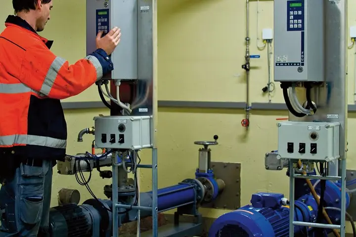 La municipalité n’utilisait auparavant que l’Emotron FDU pour la régulation de la pression et du débit, mais un Emotron VFX, développé pour ce type d’application dynamique, était désormais nécessaire. Noxon avait toujours utilisé une autre marque en standard pour ses centrifugeuses et n’avait jamais testé l’Emotron. Comme le processus utilise deux moteurs électriques, l’un pour l’entraînement et l’autre pour le freinage, il fallait une solution efficace sans résistances de freinage.