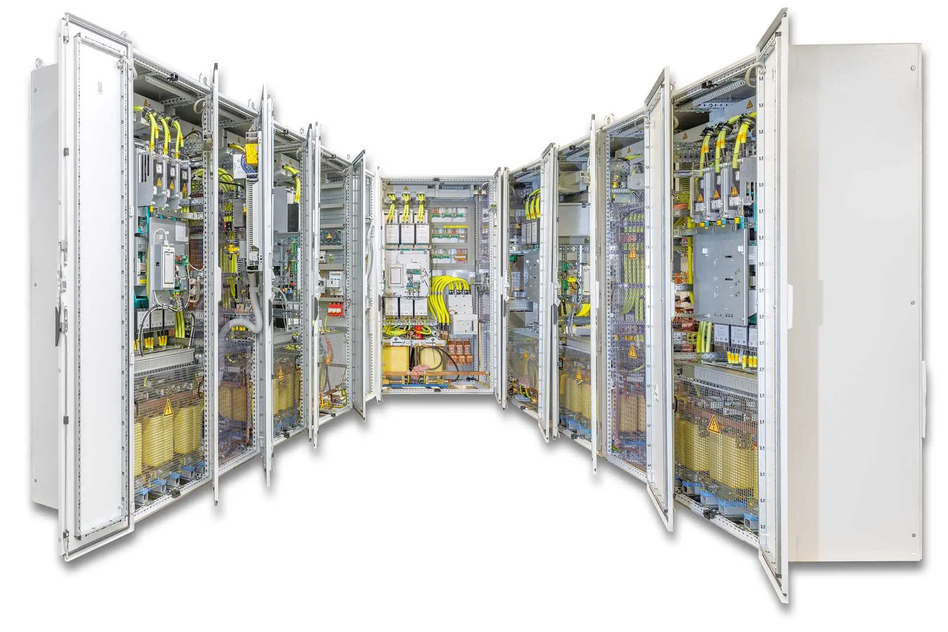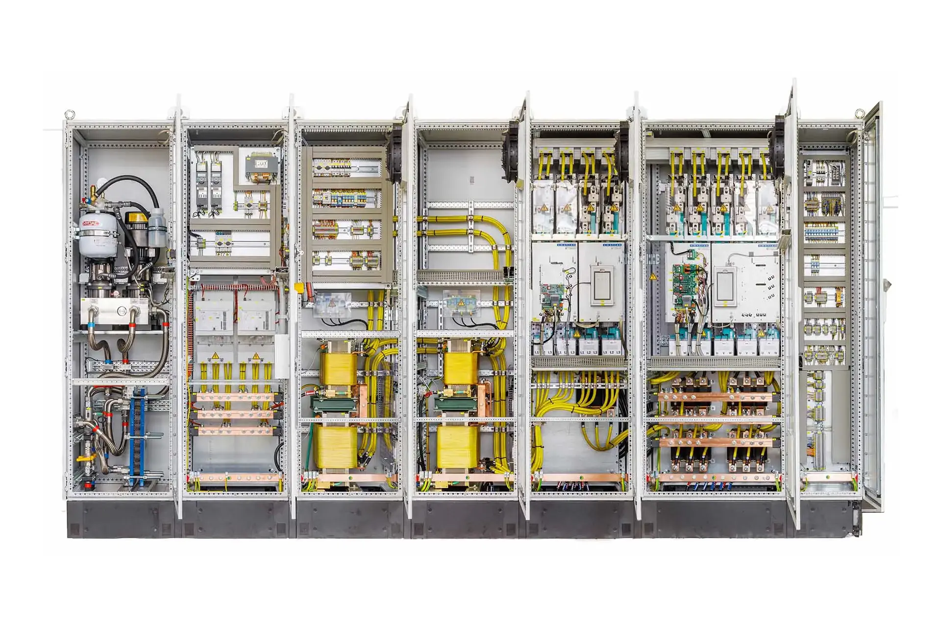 Les deux armoires construites sur mesure pour l’unité de production contiennent chacune des blocs de construction électroniques de puissance (PEBB). Les composants électroniques intelligents semblent presque identiques, mais ils ont des fonctions très différentes. Certains sont équipés d’une technologie frontale active, tandis que d’autres sont des unités de contrôle à courant continu.