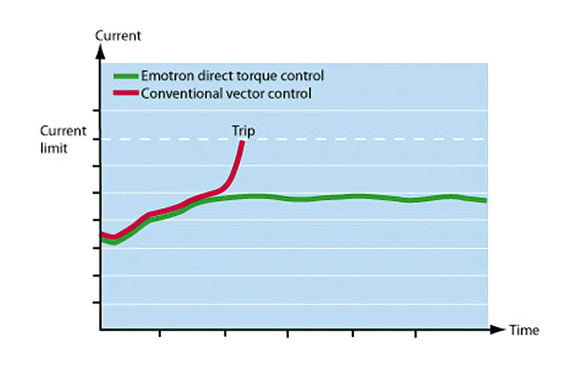 La technologie Emotron a un temps de réponse extrêmement rapide puisque le couple réel et le couple requis sont comparés 40 000 fois par seconde. Les variateurs AC peuvent fournir le couple le plus élevé possible par ampère à partir d’un moteur industriel normal, offrant la possibilité de contrôler un moteur sans capteur de rotor tout en conservant le contrôle du couple et de la vitesse.